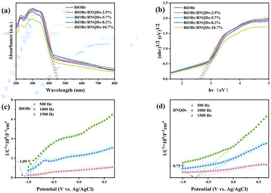 (a) UV-vis spectra, (b) Bandgap Energies, (c) Mott–Schottky curves of BiOBr and (d) BNQDs.