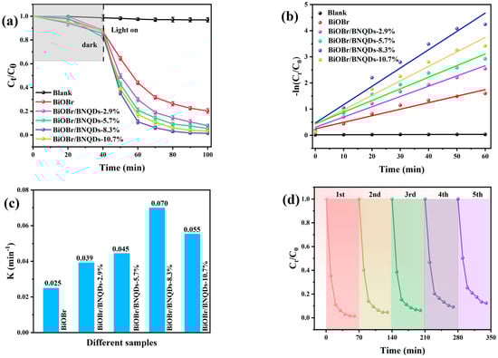 The photocatalytic degradation efficiency of the prepared catalyst was evaluated using RhB as the target pollutant in a series of experiments conducted under visible light irradiation. Prior to the photocatalytic degradation experiments, the prepared photocatalyst (30 mg) was first mixed with the prepared RhB solution (20 mg/L) and reacted under dark conditions for 40 min to achieve adsorption–desorption equilibrium. As demonstrated in Figure 5a, the degradation of RhB efficiency of the original BiOBr was only about 78% within 60 min. Nevertheless, following the incorporation of BNQDs, there was a substantial improvement in the overall photocatalytic performance (BiOBr/BNQDs-2.9%: 92%, BiOBr/BNQDs-5.7%: 94.6%, BiOBr/BNQDs-8.3%: 98.56%, BiOBr/BNQDs-10.7%: 96.71%). The outcomes suggested that the effective loading of BNQDs was a pivotal factor in augmenting photocatalytic activity. The photocatalytic degradation process in this experiment could be modeled using a pseudo-first-order kinetic model. As demonstrated in Figure 5b,c, the photocatalytic rate constants (K) of the composite materials were all greater than those of the pure BiOBr photocatalyst [43]. Among all photocatalyst samples, BiOBr/BNQDs-8.3% exhibited the highest degradation rate constant, with a K value of 0.07 min−1, which was 2.8 times greater than the original BiOBr (0.025 min−1). The enhancement of the photocatalytic degradation activity of the BiOBr/BNQDs composite material toward RhB was attributed to the introduction of BNQDs, which established a rapid charge transfer pathway between BiOBr and BNQDs, thereby effectively reducing the recombination rate of electron–hole pairs. BET surface areas (SBET) of these samples were tested. The values of SBET were 13.907 m2∙g−1, 18.32 m2∙g−1, 22.234 m2∙g−1, 20.354 m2∙g−1, and 16.453 m2∙g−1 for BiOBr, BiOBr/BNQDs-2.9%, BiOBr/BNQDs-5.7%, BiOBr/BNQDs-8.3%, and BiOBr/BNQDs-10.7% (Table S2), respectively. It was demonstrated that the photocatalytic degradation efficiency of BiOBr was progressively diminished by the excessive loading of BNQDs. This phenomenon was attributed to the excessive addition of BNQDs, which covered the active sites of the original BiOBr, which thereby reduced the specific surface area and consequently diminished the light absorption ability [44]. Subsequent electrochemical tests provided further evidence to support this hypothesis.