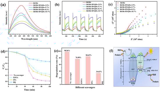 (a) PL spectra, (b) TPR curves, and (c) EIS curves for BiOBr and BiOBr/BNQDs with different mass ratios. (d) Degradation curves of BiOBr/BNQDs-8.3% as a photocatalyst after adding different radical scavengers, (e) corresponding degradation rate and (f) energy band structure diagram of BiOBr and BNQDs.