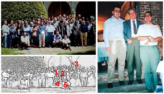 May 2000. (Left). Professor Piancatelli (1) with many of his colleagues and friends. On his left, there is his good friend, Professor Stephen Hanessian (2). This conference was organized at the Certosa di Pontignano (Siena, Italy) by the late Professor Maurizio Botta (3). Seated below are Dr. Roberto Margarita (4) and the author of this review, M.B. (5). (Right). Another photo of Professor Piancatelli (in the center) surrounded by his students, with Dr. Roberto Margarita on the left and M.B. on the right.