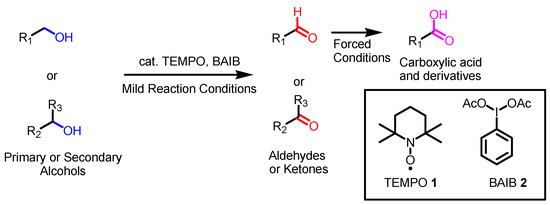 Back in 1997, funding and instrumentation were limited in the chemistry department at Roma Sapienza. No exact mass spectrometer was available; the NMR instrument was an old Gemini 200 MHz, and there was limited access to a 300 MHz instrument. However, something was not limited: scientific creativity, and most of all, scientific freedom. Professor Giovanni Piancatelli allowed his first-year PhD student Roberto Margarita to be free to test new ideas and reactions. While most of the projects they attempted led to non-useful reactions, one of them afforded a significant breakthrough. They developed a very interesting oxidation methodology using a catalytic amount of TEMPO 1 ((2,2,6,6-tetramethylpiperidin-1-yl)oxyl) or (2,2,6,6-tetramethylpiperidin-1-yl)oxidanyl) and BAIB 2 (bis(acetoxy)iodobenzene, also known as PIDA, phenyliodine(III) diacetate, or phenyl-λ3-iodanediyl diacetate), which acted as the stoichiometric oxidant. The combination of these two reagents leads to a unique methodology for the oxidation of primary and secondary alcohols to aldehydes and ketones (Scheme 1), with the possibility of further in situ overoxidation of the aldehyde to a carboxylic moiety if the reaction conditions are forced. Since the publication of the original paper in 1997 [1], this methodology has been applied several times on various complex substrates, on small and large scales. This reaction should not be confused with the Piancatelli rearrangement, a unique chemical transformation also developed by Prof. Piancatelli in 1976, which was nearly forgotten for decades and recently surged to popularity [2].