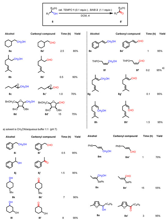 In the original paper [1], many substrates were subject to the oxidation protocol, which uses 0.1 equiv. of TEMPO 1, 1.1 equiv. of BAIB 2, DCM as the solvent, and room temperature. A catalytic load of 0.05 equiv. of TEMPO 1 still leads to the formation of some of the desired products, while no reaction occurred with 0.01 equiv. Simple primary alcohols such as compounds 8a–c can be oxidized to the corresponding aldehydes 8′a–c within a couple of hours. The reaction also works on carbohydrate derivatives such as 8d, and more recent examples will be presented in a specific section of this review.