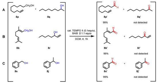 Selective oxidation of simply primary vs secondary alcohols (A), allylic primary vs allylic secondary alcohols (B), and benzylic primary vs benzylic secondary alcohols (C) in the Piancatelli–Margarita protocol.