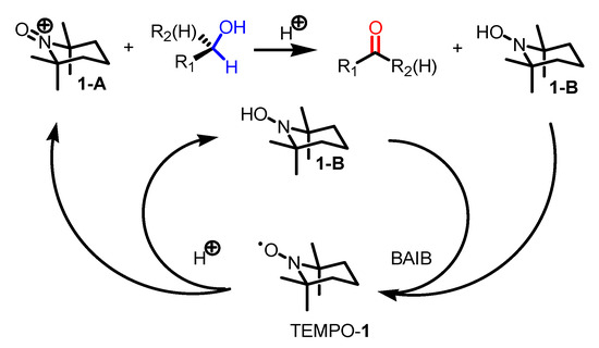 The free radical TEMPO 1 can react with alcohols in its form 1-A to afford the corresponding carbonyl compound and its reduced form 1-B; the role of BAIB 2 is to re-oxidize 1-B to continue the catalytic cycle. The rate-determining step of the reaction is often the oxidation of TEMPO 1 to TEMPO 1-A. This specific step can be catalyzed by bromine anions (Scheme 5).