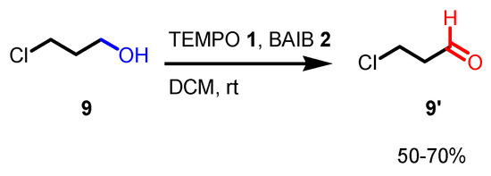 Keeping these aspects in mind, O’Reilly and coworkers attempted the oxidation of the 3-chloro propanol 9 to 3-chloro propanal 9′ with catalytic TEMPO 1 and BAIB 2 [18]. The yields are given as a range (50–70%), since during purification and concentration in vacuo some decomposition of the aldehyde 9′ to acrolein via HCl elimination occurred. This was not a major issue, since aldehyde 9′ can be telescoped in a DCM solution to the next reaction. However, in their synthesis of azetidines, they ultimately chose a different procedure based on the hydrolysis of acrolein diacetal, because it was found to be more convenient. Nevertheless, the TEMPO 1/BAIB 2 oxidation has been proven to be effective in preparing the elusive aldehyde 9′ (Scheme 6).
