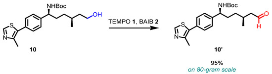 For their preparation of the anticancer agent BI 1810284, the industrial researchers of the group of Reevs reported an eighty-gram scale Piancatelli–Margarita oxidation of alcohol 10 to aldehyde 10′. In this reaction were employed 80 g of alcohol 10 (MW = 404.5 D, 90% purity, 0.18 moles), 2.8 g of TEMPO 1, and 68 g of BAIB 2. After work-up and concentration, 116 g of a mixture of aldehyde 10′ (MW = 402.5 D, 58% purity, 0.17 moles) and the residual iodobenzene were obtained. An aliquot was purified, and the purity of the aldehyde was evaluated to be around 95%. This means that 0.17 moles of aldehyde 10′ were obtained starting from 0.18 moles of alcohol 10 [19]. Since purifications are expensive on a large scale, it is not unusual that products are directly telescoped to the following steps when they are unnecessary. The by-product of Piancatelli–Margarita oxidation is iodobenzene, a relatively inert compound. This renders the reaction attractive for large-scale industrial reactions (Scheme 7).