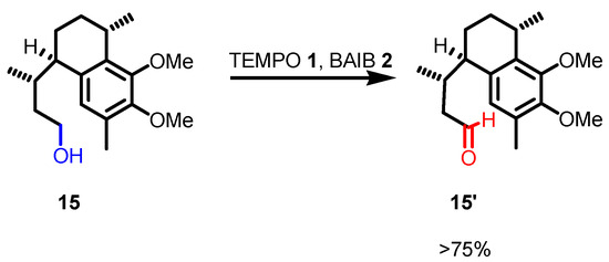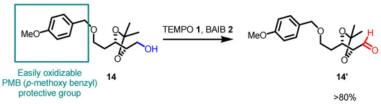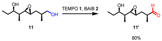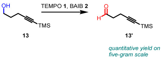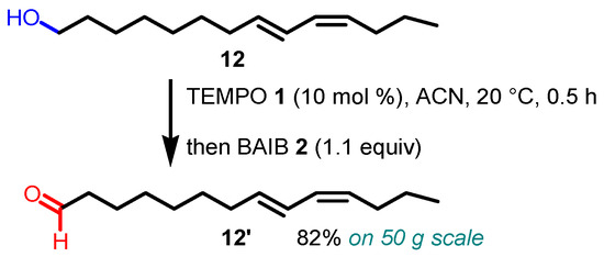 Gayon, Lefevre, and coworkers, in their large-scale synthesis of the sex pheromone of the horse-chestnut leaf miner, planned the oxidation of alcohol 12 to the desired target molecule 12′ [21]. The final reaction was run on a fifty-gram scale, using 51 g of alcohol 12, 3.8 g of TEMPO 1, and 85 g of BAIB 2 (Scheme 9). According to the authors, this synthesis is easily scalable. It is worth noting that the oxidation of alcohols at the end of long hydrophobic chains (fourteen carbon atoms, in this case) is not easy with traditional oxidants (for example, with chromium (VI) species) because of the differences in polarity between the reagents. In this case, the reaction is successful since TEMPO 1 could be hydrophobic enough to reach more effectively the hydroxyl functionality. Biodegradable pheromones can be a valuable alternative method in insect control if compared to other synthetic insecticides. Nevertheless, the preparation of pheromones must employ eco-friendly conditions, and the development of a synthesis with these characteristics was the goal of the industrial researchers.
