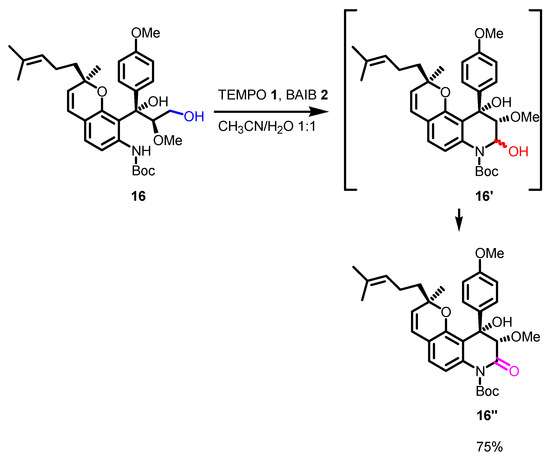 An example of the chemoselectivity of Piancatelli–Margarita oxidation was reported by Hanessian and coworkers in their synthesis of insecticide metabolite yaequinolones J1 and J2. These authors needed an oxidation method for primary alcohol 16 that would afford an intermediate, the N-protected hemiaminal 16′, which can undergo further oxidation to a lactam, specifically N-Boc dihydroquinolin-2-one 16′. They tested several oxidants (PDC, Corey−Schmidt, and PCC), but none of them was as effective and selective as the TEMPO 1/BAIB 2 combination. The hemiaminal intermediate 16 could be detected by NMR analysis after 3 h before further oxidation to the lactam took place. The authors state that, to the best of their knowledge, the TEMPO/BAIB reagent combination was used here for the first time for the direct synthesis of an N-Boc lactam from a primary alcohol [25]. It is worth noticing that neither the enol ether functionality, the aryl methoxy group, nor the labile acid-sensitive benzylic tertiary alcohol was affected (Scheme 13).