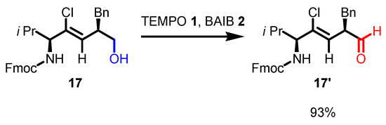 Oxidation of the primary alcohol in compound 17 without affecting the chloro-substituted double bond (Fmoc = fluorenylmethyloxycarbonyl-).