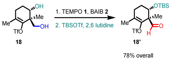 Another example of oxidation of the primary alcohol in the presence of a double bond and a secondary alcohol was reported by Sarpong and coworkers in their studies toward the synthesis of diverse taxane cores, specifically in the oxidation of alcohol 18 to aldehyde 18′, to give, after TBS protection of the secondary alcohol functional group, the taxane C-ring fragment [27]. After this two-step sequence, aldehyde 18′ could be isolated in 78% yield (Scheme 15).