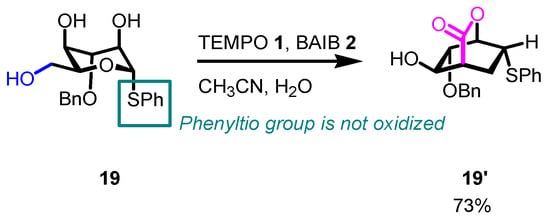 In the original paper by Piancatelli and Margarita [1], it was reported that the phenylthiol and phenylselenium functional groups are not affected by their oxidation methodology. This is noteworthy, since the phenylthiol and phenylselenium groups are usually introduced into molecules to generate a double bond upon oxidation, for example with NaIO4. Their findings on the selective alcohol group oxidation are confirmed by the work of Gardiner et al. in their efforts toward the synthesis of heparan sulfate- and dermatan sulfate-related oligosaccharides. The Piancatelli–Margarita oxidation of alcohol 19 afforded [2.2.2] bicyclic lactone 19′ in 73% yield using the “forced” conditions (acetonitrile and water) [28] (Scheme 16).