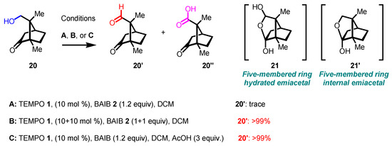 Sarpong and coworkers solved an intriguing problem in their studies toward the synthesis of the longiborneol sesquiterpenoids [29]. Their goal was to oxidize the alcohol functionality of intermediate 20 to the corresponding aldehyde in compound 20′.