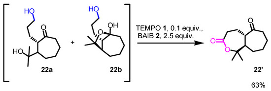The formation of internal hemiketal was also an issue faced during the synthesis of the ABC ring system of kadlongilactones reported by Wang and Chen [30]. The ketone 22a existed as a mixture with emiketal 22b, which was detected using NMR. Also, in this case, the oxidation to the corresponding lactone 22′ required more equivalents of BAIB 2 (2.5 equiv. according to the supporting information of the article by Wang and Chen cited in ref [30]; see Scheme 18).