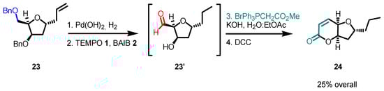 Being a versatile and robust reaction, the Piancatelli–Margarita oxidation can be incorporated in some standard synthetic sequences. One of these is the primary alcohol oxidation–Wittig reaction. An interesting example is reported by Cordero-Vargas, Sartillo-Piscil, and coworkers in their synthesis of (+)-lasionectrin [31]. Tetrahydrofuran intermediate 23 was first subject to simultaneous double bond reduction and primary alcohol deprotection; then, the oxidation of the alcoholic function gave intermediate 23′. This compound was then subject to the Wittig–Horner reaction with the resulting methyl (triphenylphosphanylidene)acetate and hydrolysis of the methyl ester to give, after DCC-mediated intramolecular lactonization, the desired compound 24 in 25% overall yield (Scheme 19).