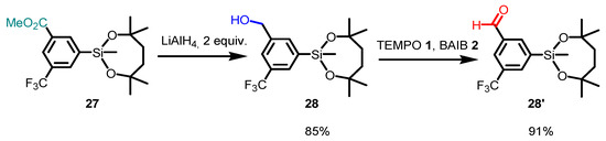 It is well-known that esters can be reduced to the corresponding aldehydes using DIBAL-H reduction. However, it can be difficult to exactly dose the amount of the reducing reagent, and since aldehydes are easily reduced with respect to esters, often the result is the formation of a primary alcohol or incomplete reduction of a mixture of compounds. From a practical point of view, it can be more convenient to use a two-step sequence: first, total reduction of the ester to primary alcohol and then partial re-oxidation to the aldehyde. Piancatelli–Margarita oxidation can be conveniently and successfully employed in the second step. A recent example can be found in the work of Saito, Shimokawa, and Yorimitsu in their studies of the dioxasilepanyl groups [33]. These authors first reduced ester 27 to primary alcohol 28 and then re-oxidized it to the desired compound 28′ in 85% and 91% yields, respectively (77% overall, Scheme 21).