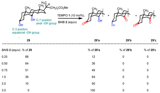 Kaspar and Kudova investigated the selectivity of oxidizing agents toward axial and equatorial hydroxyl groups. Among the several oxidants tested, there was the combination TEMPO 1/BAIB 2. Methyl chenodeoxycholate 29 bears both an axial and an equatorial group in blocked positions. When this compound was reacted with catalytic TEMPO 1 and an increasing amount of BAIB-2, only the formation of the axial-oxidized compound 29′a was observed. No amount of the equatorial-oxidized compound 29′b or diketone 29′c could be detected [34]; see Scheme 22.