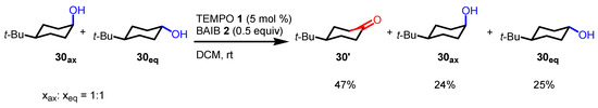 The authors also studied the oxidation of cis 4-t-butyl cyclohexanol 30ax, in which, due to the bulky t-butyl group, the hydroxy moiety is conformationally blocked in the axial position, and of trans 4-t-butyl cyclohexanol 30eq, where the hydroxy group is instead fixed in the equatorial position. However, in this case they found that ketone 30′ was formed, consuming equal amounts of cis 4-t-butyl cyclohexanol 30ax and of trans 4-t-butyl cyclohexanol 30eq. They hypothesize that the reason why this reaction is nonselective now is that no significant steric hindrance is present around the axial or equatorial hydroxy group (Scheme 24). Their results are relevant because they suggest that the TEMPO 1/BAIB 2 combination can be quite sensitive to steric factors.