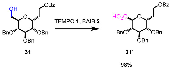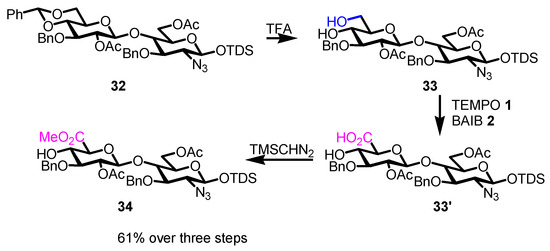 A similar oxidation procedure was incorporated in a three-step sequence, as reported by Boons in 2020, for the preparation of a disaccharide unit for the synthesis of heparan sulfate oligosaccharides [36]. These consecutive reactions were run on a 1 g scale. The consecutive reactions involved first the TFA-mediated selective cleavage of the acetal on disaccharide 32; then, the TEMPO 1-catalyzed/BAIB oxidation of the primary alcohol of intermediate 33 to give carboxylate 33′ in a mixture of DCM; and finally, the formation of the methyl ester 34 using trimethyl silyl diazomethane (TMSCHN2). The entire sequence has a satisfying yield of 61%, despite the presence of several functional and protective groups (see Scheme 26).