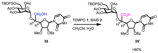 While working toward the total synthesis of the natural substance capuramycin, Xiao and coworkers needed to oxidize the primary alcohol function on compound 35 to a carboxylate moiety [37]. The usual combination of catalytic TEMPO and BAIB in acetonitrile and water (the more forcing conditions using a more polar solvent mixture; see introduction) proved effective, accessing intermediate 35′ in over 90% yield (Scheme 27).