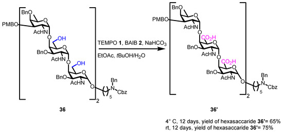 An impressive example of TEMPO 1/BAIB 2 multiple oxidations on complex molecules was reported by the group of Codée while synthesizing a set of Staphylococcus aureus capsular polysaccharides [38]. These authors needed to oxidize a primary alcohol functional group to a carboxylic moiety. They modified the original protocol, using instead a mixture of ethyl acetate and t-butanol/water with the addition of sodium bicarbonate. They tested their improved condition reaction on some substrates and even on the complex molecule hexasaccharide 36, which also contains an easily oxidizable protective group (PMB = p-methoxybenzyl). As mentioned before, this moiety can normally be cleaved by mild oxidation with DDQ (2,3-dichloro-5,6-dicyano-1.4-benzoquinone). Despite this, hexasaccharide 36′ was obtained in 65% yield after 12 days, and, if the reaction time is shortened to 6 days and the reaction temperature is increased to room temperature, the yield rises to 75% (Scheme 28).