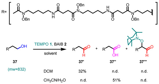 Reactions on molecules with high molecular weight represent a unique challenge. Reactions on similar small molecules can give a similar outcome. As an example, it is expected that an oxidation on a five-carbon primary alcohol would be a similar reaction to a six-carbon primary alcohol, but the outcome might change dramatically if the same reaction is then run on a primary alcohol that has twenty carbon atoms or more. Organic molecules with few atoms can have a limited number of possible conformations. The number of conformations increases exponentially with the number of atoms; therefore, the functional group can be “hidden” in a specific conformation. This is especially true with molecules with long chains. Domain separation could occur between the strongly hydrophobic substrate and a water-soluble oxidant. Therefore, finding a successful reaction on long-chain molecules is not straightforward. As seen before (ref. [21]), TEMPO 1 could be hydrophobic enough to reach the “reaction pocket”. Chambron and coworkers were studying an enantiopure bifunctional chelator for 89Zr-immuno PET. Specifically, they were looking for a tetradentate ligand or zirconium [39]. One of the reactions they needed was the oxidation of primary alcohol 37, whose molecular weight is more than 800 Dalton. Even on this complex molecule, the Piancatelli–Margarita oxidation works well, affording aldehyde 37′ in 32% yield if the usual reaction conditions are used (DCM as the solvent) and carboxylic acid 37″ in 51% yield if the solvent is changed to an acetonitrile/water mixture. These authors did not detect any of the TEMPO 1-substrate adducts (Scheme 29).