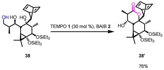 Carreira and Fadel reported in 2023 the first enantioselective total synthesis of (+)-pedrolide, a tigliane-derived diterpenoid, showing an unprecedentedly reported skeleton. One of their late-stage key transformations was the selective oxidation of the primary alcohol of intermediate 38 to give lactone 38′ in 76% yield using what they called “Piancatelli’s and Margarita’s TEMPO oxidation protocol” [40]; see Scheme 30.