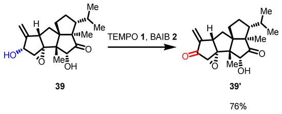 A selectivity between secondary alcohol oxidations has been reported by Hao, Ding, and coworkers in their synthesis of (−)-crinipellins [41]. In this case, the different reactivity of the two secondary hydroxy groups on compound 39 was because the allylic hydroxy group can be easily oxidized. The reaction proceeded in 76% yield to give enone 39′ (Scheme 31).