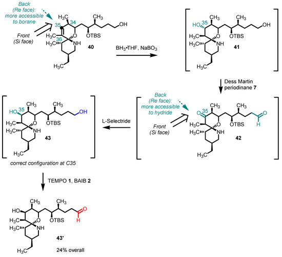 A selective oxidation (primary alcohol vs. secondary alcohol) was also needed by Woo and coworkers in their enantioselective synthesis of sangliferin A. These researchers installed a hydroxy group in a stereo-controlled manner on intermediate 40 [42]. The configuration of the C36 stereocenter was correct. Unfortunately, the configuration obtained at the C35 stereocenter was instead the opposite with respect to the target compound. This was not unexpected, since hydroboration would most likely have occurred on the less hindered Re face of the C35-C36 double bond because the Si face of compound 42 is hindered by the methyl group in the C34 position. To solve this issue, the authors had to re-oxidize the secondary alcoholic function (and most likely also the primary one, although this is not explicitly stated in the paper) using Dess–Martin periodinane 7 and then operate a selective reduction on compound 43. In this case, both the methyl groups on the C34 and C36 positions direct the attack of the hydride on the less hindered Re face of the ketone on the C35 position of compound 43. Finally, the primary alcoholic function was oxidized with the standard Piancatelli–Margarita conditions to give aldehyde 43′ in 24% overall yield over four steps (Scheme 32).