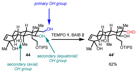 The selective oxidation of the primary alcohol functional group of intermediate 44 in the presence of two secondary alcohol groups (TIPS = triisopropylsilyl-).
