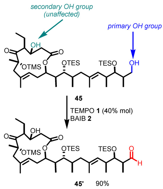 Another impressive example of selective primary hydroxy group oxidation in the presence of a secondary one at an advanced synthetic step was reported by Paterson and coworkers in their approach toward the synthesis of actinoallolides [44,45]. Thus, the selective oxidation of alcohol 45 gave aldehyde 45′ in excellent yield (90%; see Scheme 34).