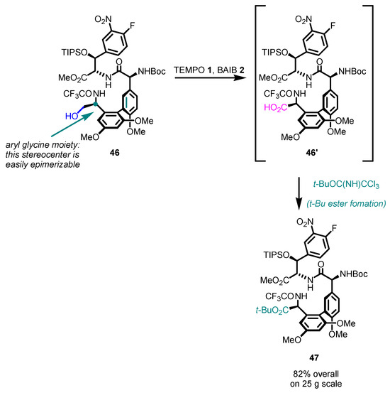 As the last example, it will be presented an important example of the work of Boger and coworkers in their synthesis of vancomycin and its analogue tetrachlorovancomycin [46,47] because it summarizes most of the aspects that have already been encountered in this review (mild condition, chemoselectivity, and applicability in telescopic and large-scale reactions and in the synthesis of complex molecules). A late intermediate in the synthesis of vancomycin (compound 46) was subject to oxidation to carboxylic acid 46′ on an impressive 25-gram scale. A t-butyl ester was then formed by using t-butyl 2,2,2-trichloroacetimidate in 82% overall yield (Scheme 35).