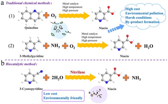 Niacin (also known as nicotinic acid or vitamin B3) is a water-soluble vitamin belonging to the B-vitamin family, one which plays key roles in cellular metabolism and energy production [1,2]. In addition to its biological significance, niacin is extensively used in the pharmaceutical and food industries in treatments for pellagra [3,4] and hyperlipidemia [5,6]. It also can be utilized as an antistatic agent, preservative, biocide, chelating agent, and organocatalyst [7,8]. Traditionally, niacin can form through chemocatalysis from quinoline or 3-methylpyridine [9] (Figure 1a) under harsh reaction conditions (high temperature, high pressure), a process which is prone to by-products and therefore one that pollutes the environment. With the increasing demand for niacin, there is a growing need for manufacturing methods that are more efficient and sustainable [8].