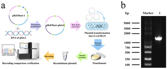 Construction and validation process of recombinant E. coli pRSFDuet-afnitA (a); Agarose gel electrophoresis of afnitA gene [left lane: Marker (unit: bp)] (b).