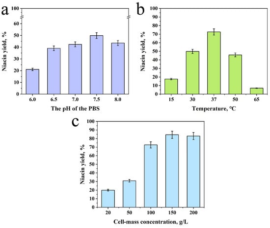 Effects of the pH of the PBS (6.0–8.0) (a), temperature (15–65 °C) (b), and cell-mass concentration (20–200 g/L) (c) in the transformation of 3-cyanopyridine to niacin.