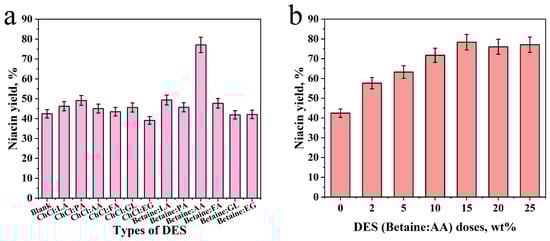 Effects of doses of the different types of DES (25 wt%) (a) and DES (Betaine:AA) (wt%) (b) on the transformation of 3-cyanopyridine to niacin.