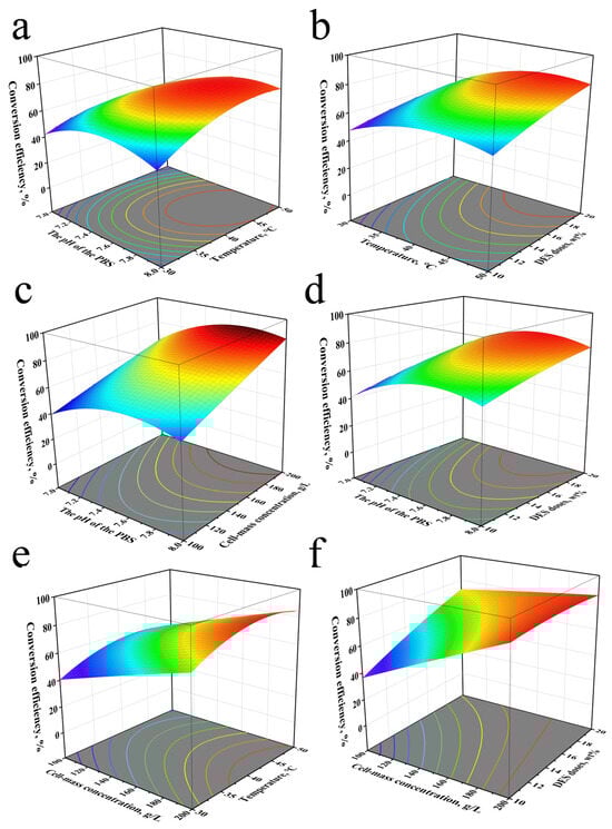 Response surface modeling of the influence of the pH of the PBS (7.0–8.0) and temperature (30–50 °C) (a); the influence of temperature (30–50 °C) and DES doses (10–20 wt%) (b); the influence of the pH of the PBS (7.0–8.0) and cell-mass concentration (100–200 g/L) (c); the influence of the pH of the PBS (7.0–8.0) and DES doses (10–20 wt%) (d); the influence of cell-mass concentration (100–200 g/L) and temperature (30–50 °C) (e); and the influence of cell-mass concentration (100–200 g/L) and DES doses (10–20 wt%) (f).