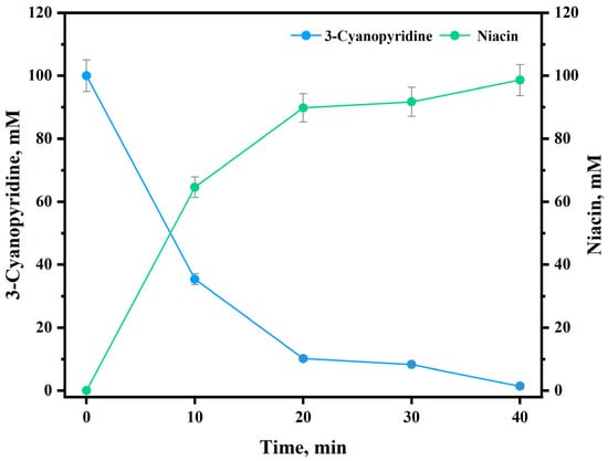 Time course for niacin synthesis from 3-cyanopyridine by AfnitA whole-cell catalysis [reaction conditions: 100 mM 3-cyanopyridine in PBS buffer (pH 7.75) with 195 g/L cell-mass concentration, 18.04 wt% DES (Betaine:AA), 10 wt% ethanol as co-solvent, and reaction temperature at 44.24 °C].
