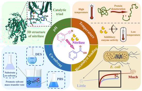 This research aimed to enhance the catalytic activity of nitrilase by optimizing various factors affecting its catalysis, including pH, temperature, co-solvent, and cell loading, as briefly illustrated in Figure 7. The pH value of the bioreaction system is crucial in affecting the activity of nitrilase, and changes in pH can impact the protonation state of catalytic residues, enzyme structural stability, and substrate binding efficiency [58]. Moreover, the temperature of the reaction system significantly influences the activity of nitrilase. Excessively high and low temperatures can affect enzyme activity. High temperatures may cause protein denaturation, disrupting the three-dimensional structure of the enzyme, especially the fine conformation of the active site, leading to loss of activity or even irreversible deactivation. Low temperatures reduce the frequency of molecular collisions and decrease the reaction rate, and thus inhibit enzyme activity [59,60]. Solvent systems are widely used in enzymatic reactions to optimize enzyme activity, stability, and substrate selectivity by adjusting the solvent environment [61,62,63]. Thus, the introduction of a DES can improve mass transfer efficiency in solvents. Compared to some traditional ionic liquids, a DES often has lower viscosity, which facilitates increased relative movement speed between molecules, thereby enhancing mass transfer rates. The whole-cell loading of nitrilase biocatalyst also critically impacts its catalytic activity. When the cell dose is low, the insufficient quantity of biocatalyst results in fewer available active sites for catalysis, slowing down the overall reaction rate. By optimizing these factors, highly efficient conversion of 3-cyanopyridine to niacin was implemented through the whole-cell catalysis. In the future, more strategies will be implemented, such as immobilized enzyme technology and directed molecular modification techniques, to address the issue of low nitrilase activity and achieve cost-effective conversion of 3-cyanopyridine to niacin. Although this work primarily focused on improving the synthesis efficiency of niacin, its practical application still requires consideration of product separation and purification. In future work, downstream purification methods such as crystallization (taking advantage of the low solubility of niacin under acidic conditions), solvent extraction, or ion-exchange chromatography could be explored to obtain a high-purity product and facilitate the industrial application of this process.
