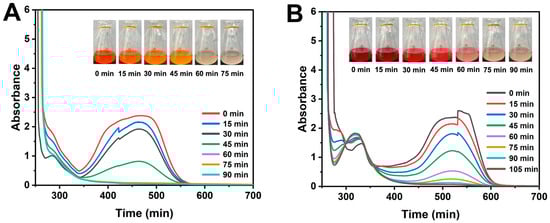 Dye wastewater in practical scenarios often occurs in aerobic environments. Nevertheless, studies on the aerobic decolorization of dyes by exoelectrogenic bacteria have been notably limited. Thus, this study delves into the aerobic decolorization capabilities of S. oneidensis MR-1 towards MO and Am. As illustrated in Figure 1, 90 mg/L solutions of MO and Am turned colorless after incubating with S. oneidensis MR-1 for 60 and 90 min, respectively. Furthermore, the UV–visible spectra (250–700 nm) of MO and Am were analyzed. After decolorization, the absorption peaks at 465 nm (Figure 1A) and 520 nm (Figure 1B) for MO and Am, respectively, vanished. The disappearance of these peaks at 465 nm and 520 nm reflects the cleavage of conjugated azo bonds in MO and Am [17,18], potentially causing a blue shift in the UV absorption spectrum. Additionally, the presence of sodium lactate, glucose, and yeast extract in the culture medium, serving as electron donors, facilitated dye decolorization (Figure S1). Figure S1 shows that S. oneidensis MR-1 completely lost dye degradation capability in the absence of lactate or glucose, demonstrating their essential role in activating the aerobic degradation pathway. Specifically, lactate and glucose sustain S. oneidensis MR-1 metabolism, supporting its pollutant degradation under stress. The rapid decolorization observed (60–90 min) contrasts with reported anaerobic degradation rates for similar dyes (typically hours to days) [16], highlighting a potential advantage of aerobic metabolism in accelerating dye breakdown.