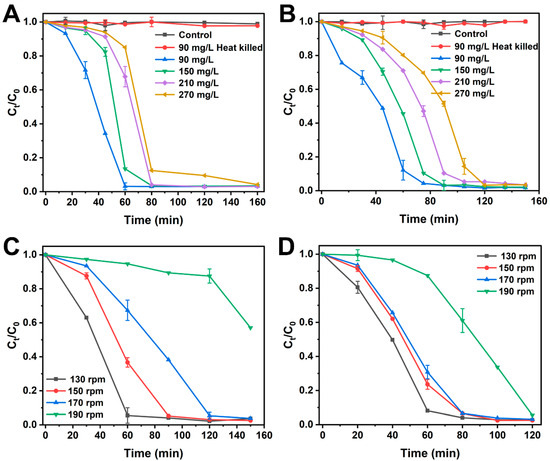 Previous studies have shown that most biodegradation of dyes occurs under anaerobic conditions, illustrating that O2 is a key factor affecting dye decolorization [9,10]. It is evident that the presence of O2 leverages the electrons released by S. oneidensis MR-1, thereby inhibiting dye degradation. However, in this study, the effect of oxygen was eliminated using a specially prepared medium, and the effect of different oxygen concentrations on dye degradation was tested. As depicted in Figure 2C,D, S. oneidensis MR-1 exhibited decolorization capabilities at different shaker speeds. Notably, for both MO and Am, the maximum decolorization efficiency was attained at 130 rpm. For MO degradation, the decolorization efficiency gradually decreased with an increase in O2 concentration. S. oneidensis MR-1 was still able to decolorize MO at 190 rpm, but a longer adaptation period of 120 min was required. This might be attributed to the preference of bacteria for growth at higher shaking speeds [30]. Similarly, the degradation of Am as a function of O2 concentration had a similar effect to that of MO, but the range of decolorization efficiency of Am at 130–170 rpm was smaller than that of MO. Furthermore, at 190 rpm, S. oneidensis MR-1 exhibited a shorter adaptation period of 40 min for Am degradation, possibly indicating that Am possesses a stronger electron-accepting capability than MO. These results underscore the robust decolorization capability of S. oneidensis MR-1 even under high O2 concentrations.