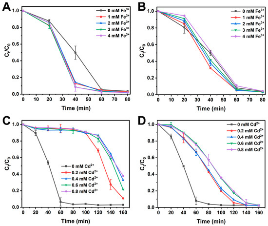 It is noteworthy that wastewater often contains various metal ions, such as Cd2+ and Fe3+, which have the potential to impact aerobic decolorization by microorganisms [31]. In this study, the effect of metal ions within the ranges of 1–4 mM Fe3+ and 0.2–0.8 mM Cd2+ on the decolorization of 90 mg/L dyes was investigated. In this context, when no other metal ions were added, approximately 98.5% of MO and 96.9% of Am were degraded within 90 min (Figure 3A,B). The addition of Fe3+ had a minor enhancing effect on MO decolorization but did not significantly promote Am decolorization, indicating that Fe3+ has a small promotion effect on the dye degradation performance of S. oneidensis MR-1. Conversely, the presence of Cd2+ markedly inhibited dye decolorization, with higher Cd2+ concentrations resulting in longer decolorization times (Figure 3C,D). For MO degradation, the addition of Cd2+ led to a sharp decrease in decolorization efficiency.