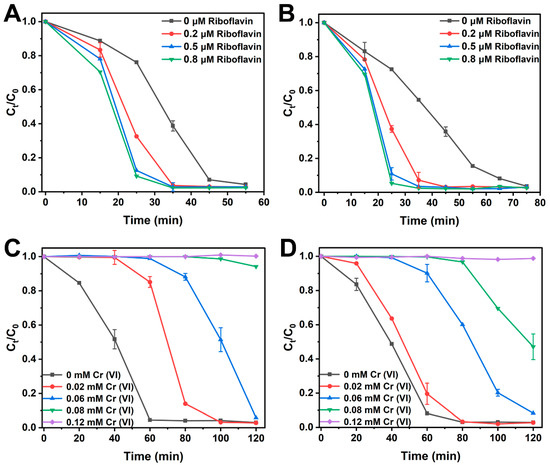 Numerous studies have confirmed that S. oneidensis MR-1 can secrete flavin as an electron shuttle, expediting the reduction of extracellular electron acceptors [16]. Therefore, experiments with additional riboflavin dosages were conducted to investigate whether extracellular electron mediators could enhance the decolorization of azo dyes by S. oneidensis MR-1. As depicted in Figure 4A,B, the addition of riboflavin significantly accelerated the biodegradation of MO and Am. With increasing riboflavin concentration, decolorization rates improved. When 0.8 μM riboflavin was added, the removal efficiency of MO increased 2.6-fold after 15 min of incubation and 3.8-fold after 25 min (Figure 4A). In alignment with MO, the Am degradation exhibited similar effects, increasing 1.8-fold after 15 min and 3.4-fold after 25 min (Figure 4B). Since riboflavin is primarily reduced in the outer membrane via the Mtr pathway [34] and serves as an electron shuttle between the cell surface and extracellular electron acceptors, it expedites dye decolorization. Consequently, the reduction of dyes is attributed to electrons released from the cell surface rather than to specific enzymes. These results indicate that MO and Am primarily decolorize extracellularly. Thus, dyes can be directly reduced by the outer membrane cytochromes MtrC/OmcA or indirectly via riboflavin serving as an electron shuttle. In theory, electron acceptors with higher redox potentials are more likely to acquire electrons from the cell surface. However, despite O2 having a higher redox potential than MO and Am, the reduction of these dyes was not inhibited by O2. This suggests that lactate and glucose in combination promote S. oneidensis MR-1 to exhibit potent reduction reactions. Furthermore, the sulfonic groups at the para-position of azo bonds in MO and Am act as strong electron-withdrawing groups through resonance, facilitating electron transfer to the dyes [35]. Therefore, the selectivity of S. oneidensis MR-1 for extracellular electron acceptors is not only related to redox potentials but may also be related to other factors such as molecular structure and absorbance [36].