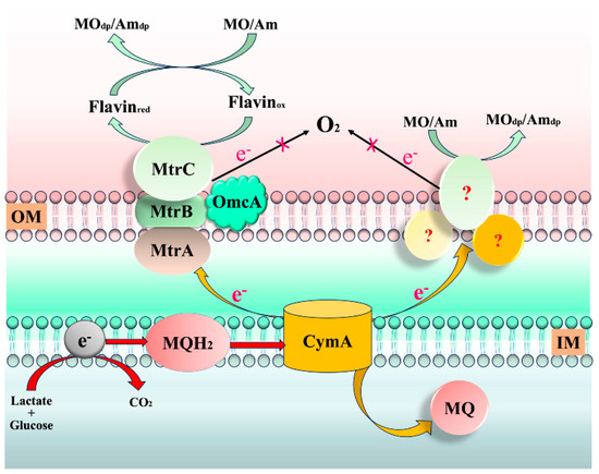 Additionally, prior studies have suggested that the decolorization of dyes by S. oneidensis MR-1 occurs under anaerobic conditions, excluding the involvement of O2 [16]. Therefore, based on the aforementioned results, we hypothesize that under aerobic conditions, the biodecolorization of MO and Am by S. oneidensis MR-1 might also proceed through the Mtr pathway (Figure 5). The inner membrane c-type cytochrome CymA within S. oneidensis MR-1 is indispensable. During the decolorization of MO and Am, electrons from the inner membrane quinone pool are relayed to the Mtr respiratory pathway through CymA. MO and Am can be directly reduced via MtrC/OmcA or indirectly through flavins. In this cultivation system, even in the presence of O2, S. oneidensis MR-1 is still prompted to transfer electrons to the dyes, resulting in their decolorization. Furthermore, it is plausible that the combined action of lactate and glucose may stimulate the unique degradation pathways of S. oneidensis MR-1. For instance, electrons from CymA could also be transferred through other conduits composed of MtrE and DmsF (a homolog of MtrB) traversing the outer membrane [34]. In summary, under aerobic conditions, the exact pathways through which electrons are transmitted during azo dye reduction remain to be further investigated.
