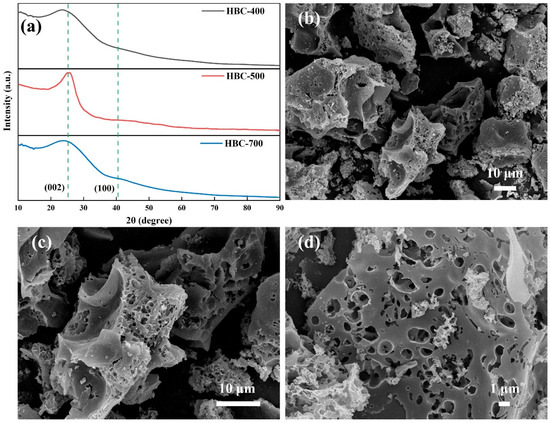 (a) XRD curves of HBC-400, HBC-500, and HBC-700; (b–d) SEM image of HBC-500.