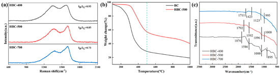 (a) Raman spectra of HBC-400, HBC-500, and HBC-700; (b) thermogravimetric (TG) curves of BC and HBC-500; (c) FT-IR spectra of HBC-400, HBC-500, and HBC-700.