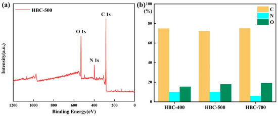 (a) XPS full spectrum of HBC-500; (b) C, N, and O elemental ratios of HBC-400, HBC-500, and HBC-700.