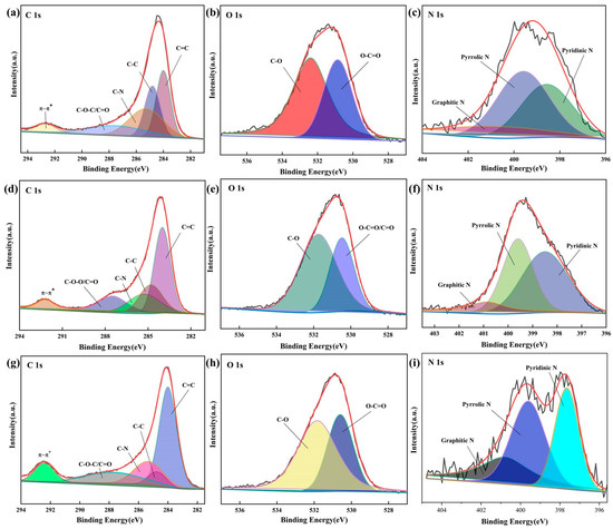 Partition peaks of C, N, and O elements for (a–c) HBC-400, (d–f) HBC-500, and (g–i) HBC-700 catalysts.