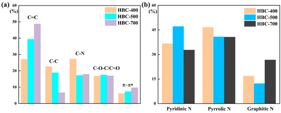 In order to analyze the form and distribution ratio of each material present in the catalyst, XPS tests were carried out on HBC-400, HBC-500, and HBC-700, respectively, and the results of the test data were analyzed and counted. As can be seen from Figure 3a, the main diffraction peaks of HBC-500 represent the elements C, N, and O. The elemental proportions of the three catalyst materials were quantified by peak area, and the results are shown in Figure 3b. The elemental proportion of C in the biomass carbon materials basically remained around 72–75% as the pyrolysis temperature increased, while the elemental proportions of N and O fluctuated more significantly, decreasing from 9.83% to 5.94% and increasing from 15.34% to 19.06%, respectively.