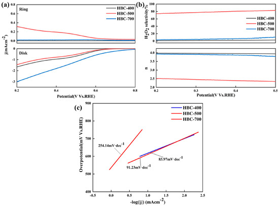 Figure 6a shows the RRDE curves of HBC-400, HBC-500, and HBC-700. Both HBC-400 and HBC-500 exhibit two-stage oxygen reduction, indicating a trend towards two-electron transfer in the direction of electrocatalytic oxygen reduction. It can be observed from the ring current collected that HBC-500 exhibits a higher ring current intensity than HBC-400 and HBC-700, which indicates that a large amount of hydrogen peroxide is produced on the surface of HBC-500 during the ORR process. Electron transfer number calculations and hydrogen peroxide selectivity calculations for RRDE showed (Figure 6b) that the electron transfer numbers of HBC-400, -500, and -700 were 3.96, 2.39, and 3.86, respectively, corresponding to hydrogen peroxide selectivities of 2.07%, 80.47% and 6.68%, indicating that HBC-500, as an excellent two-electron oxygen reduction catalyst, has an excellent electron transfer number.