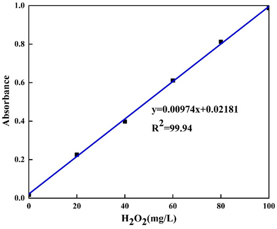 For the detection of hydrogen peroxide, the potassium titanium oxalate assay was used. The specific procedure was as follows: firstly, a potassium titanium oxalate solution with a concentration of 0.05 M and a sulphuric acid solution with pH = 3 were configured, then the concentrations of 100 mg·L−1, 80 mg·L−1, 60 mg·L−1, 40 mg·L−1, and 20 mg·L−1 were configured, respectively, and the potassium titanium oxalate solution and the sulphuric acid solution were mixed in a 1:1 ratio by volume and left to stand for 10 min. The solution was then mixed with hydrogen peroxide in a ratio of 1:3 and allowed to stand for 15 min before being suppressed in a quartz cuvette. The absorbance was tested by a UV spectrophotometer at 385 nm, and a standard curve for the detection of hydrogen peroxide was constructed. The fitted results are shown in Figure 7.